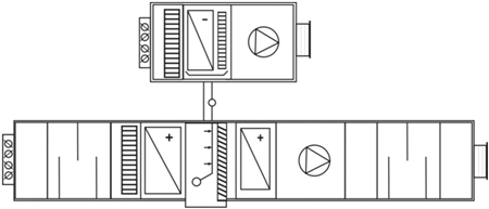 В случае использования в качестве контактного теплообменника форсуночной камеры орошения, она устанавливается в приточной установке центрального кондиционера. В вытяжной установке кондиционера применяется контактная камера осушения и поверхностный воздухоохладитель. Схема секции утилизации тепла с контактным теплообменником.На схеме представлена компоновка центрального кондиционера прямоточного типа, оснащенного секцией утилизации тепла с контактным теплообменником и секциями глушения шума.