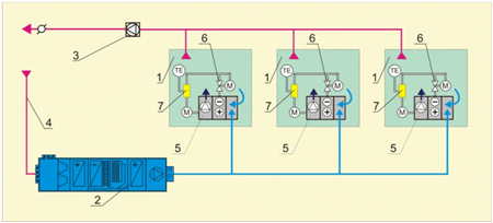 На схеме показаны: 1 – помещения; 2 – центральный кондиционер; 3 – вытяжной вентилятор; 4 – воздухозаборное устройство; 5 – фанкойл; 6 – регулирующий клапан на обратном трубопроводе; 7 – регулятор скорости вращения вентиляторного доводчика. К преимуществам подобных систем относят: